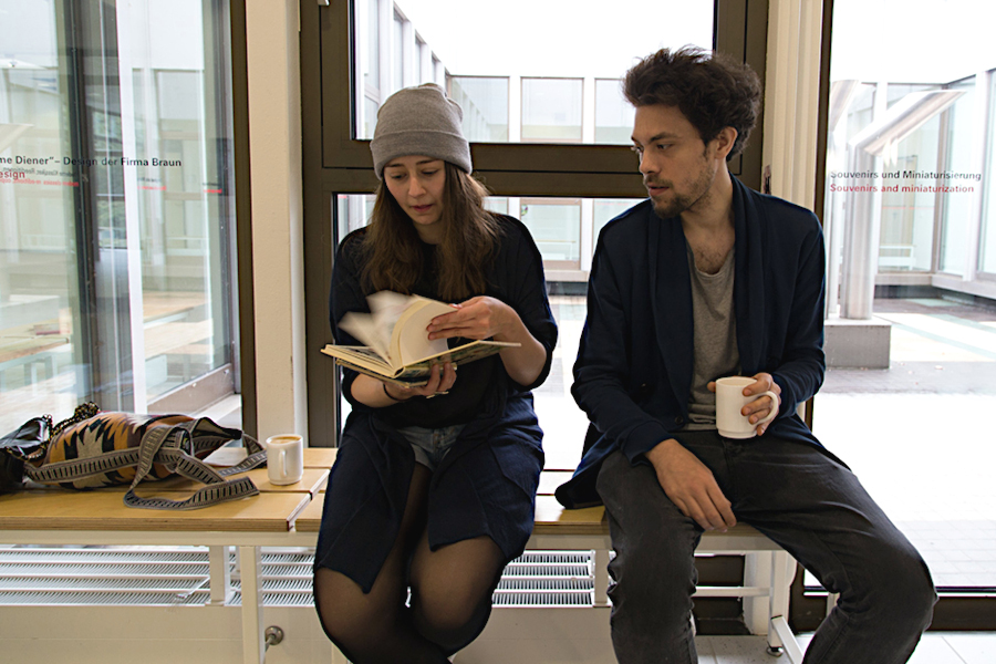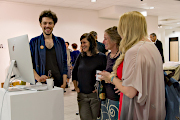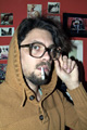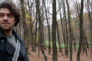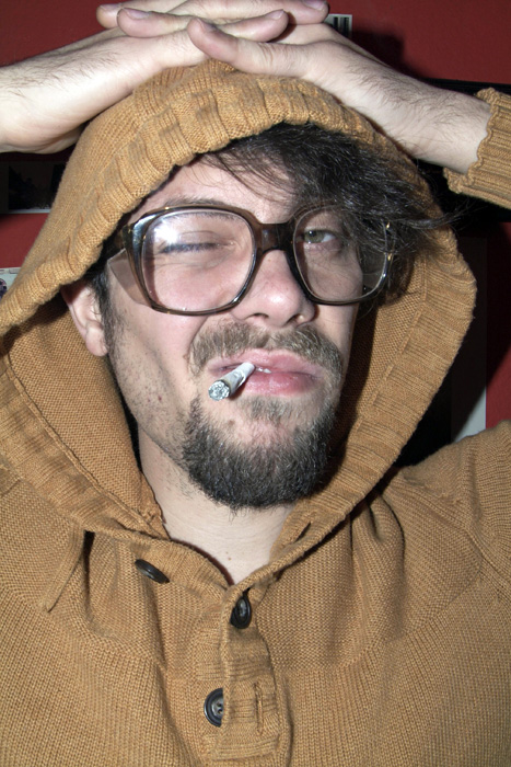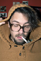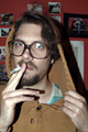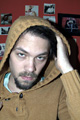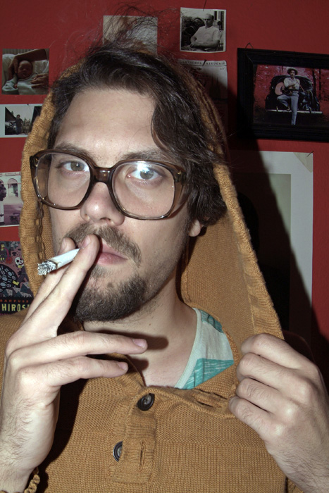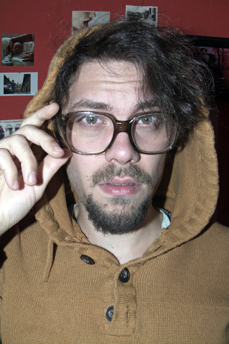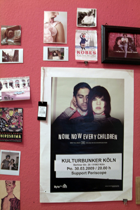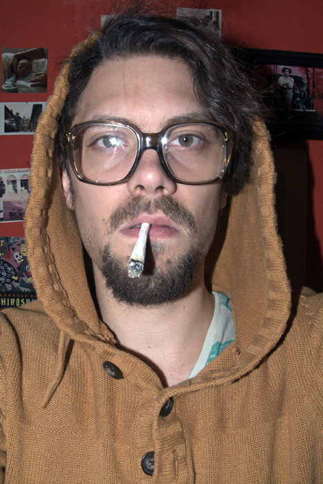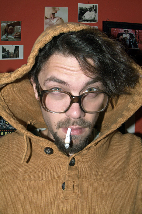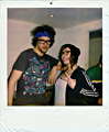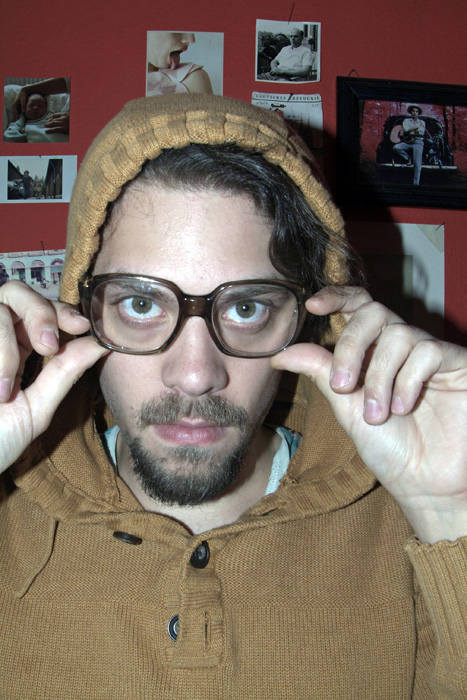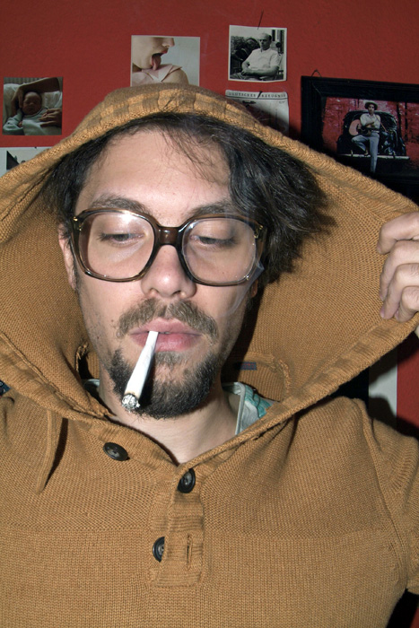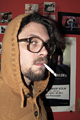 mit einem Babyfoto von ihm, einem Polaroid als Kind mit seinem Haustier, ein anderes zeigt ihn in einem Pappkarton, und ein altes Foto seines Großvaters ...